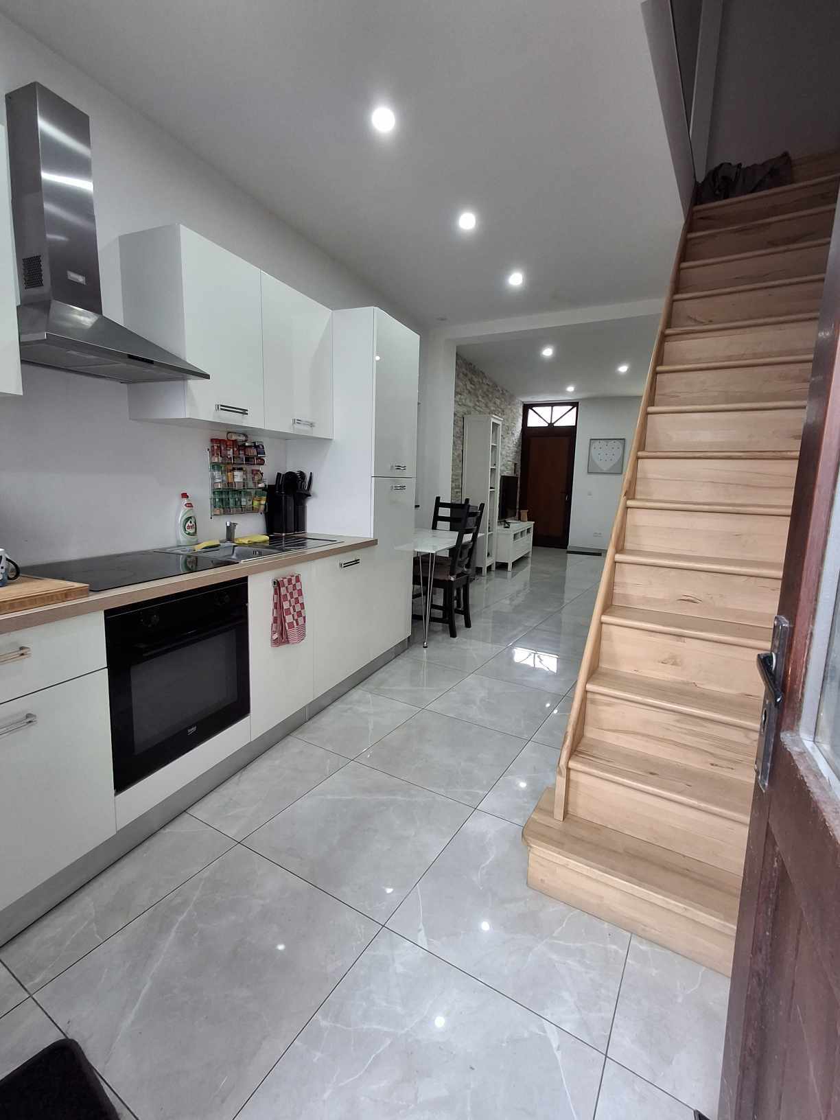 - Rez-de-chaussée: salon de ± 30 m² avec cuisine USA équipée (taques vitro, four, frigo, lave-vaisselle, hotte)