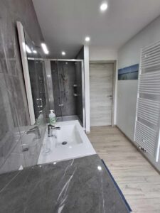- 1er étage: 1 chambre de ± 15 m², une salle de douche de ± 6 m²